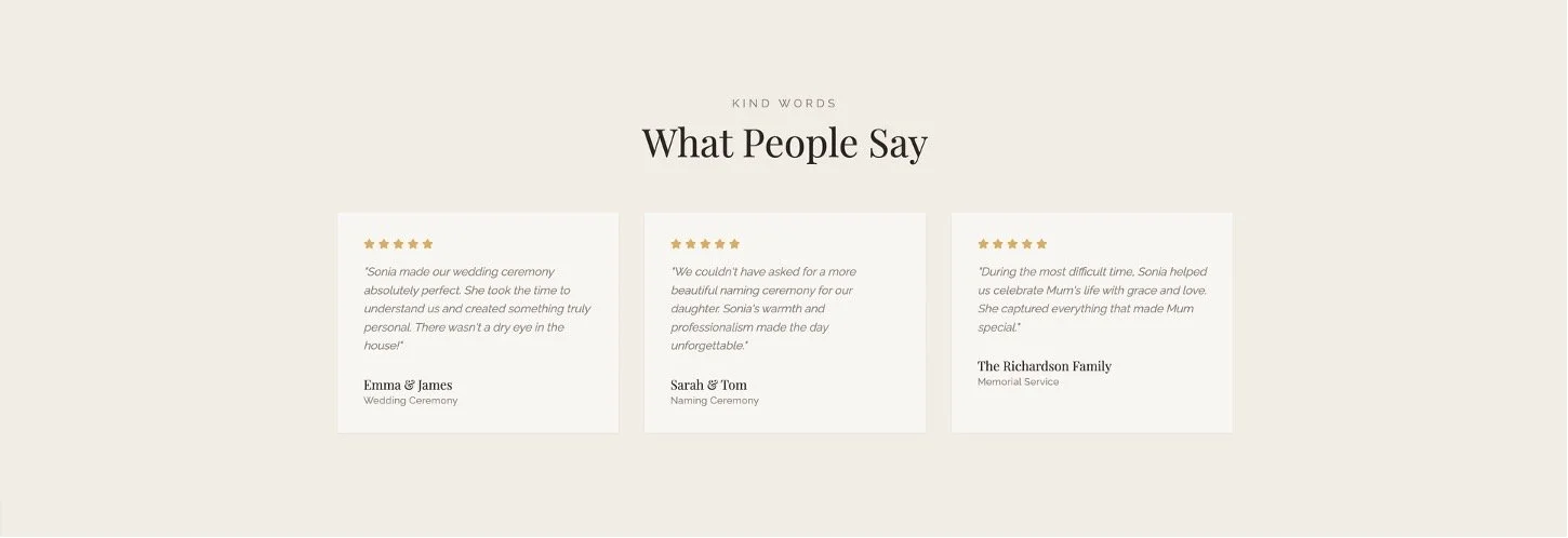 With warmth, care and a genuine love for story-telling, I work closely with you to craft a ceremony that feels completely yours, no scripts, no formulas, just your story told beautifully.